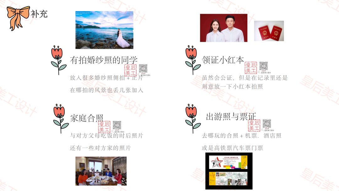 開頭(第一頁)命名可以用兩人的名字結合 最重要是排列有序並且充分讓人明白你們的故事 不要害羞,越肉麻的對話越好 交易記錄一定要有 去對方老家一定要多拍照!風景家人家裡都拍 能跟他們家人合照是最好