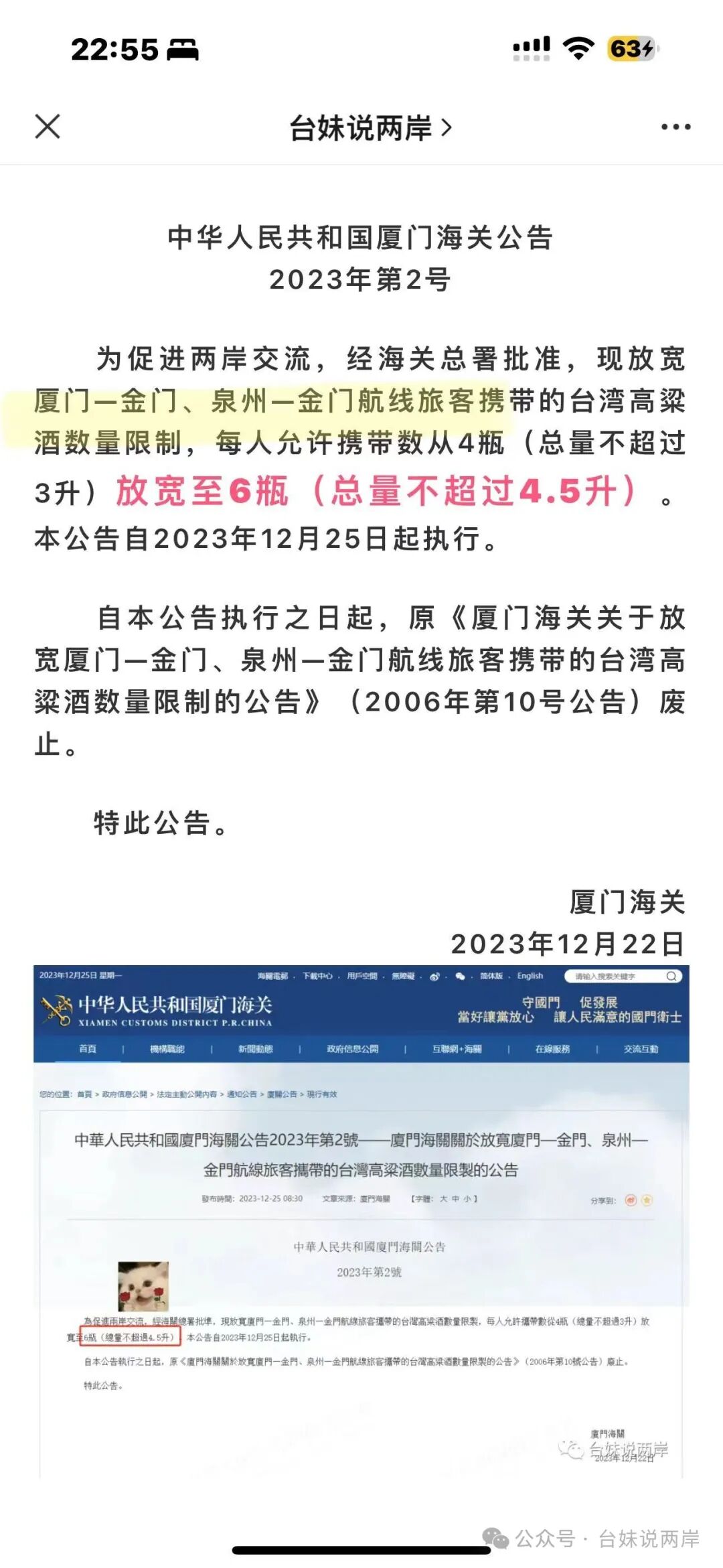 (小三通部份放寬金門到全州/夏門,有放寬高梁限制)