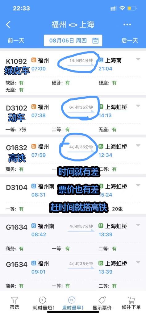 同時,在出發地和目的地一樣時,高鐵票在價格上一般比動車票更貴。