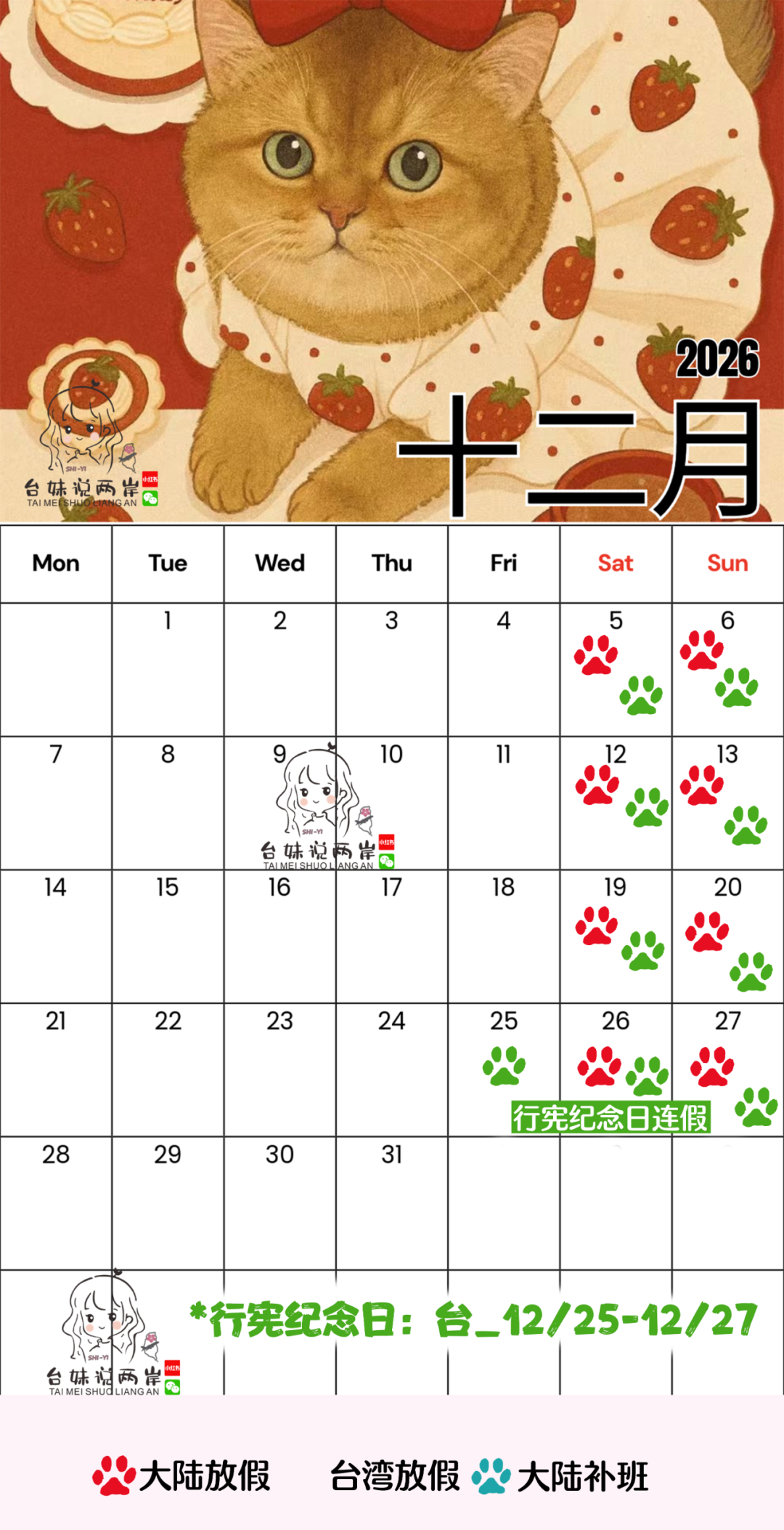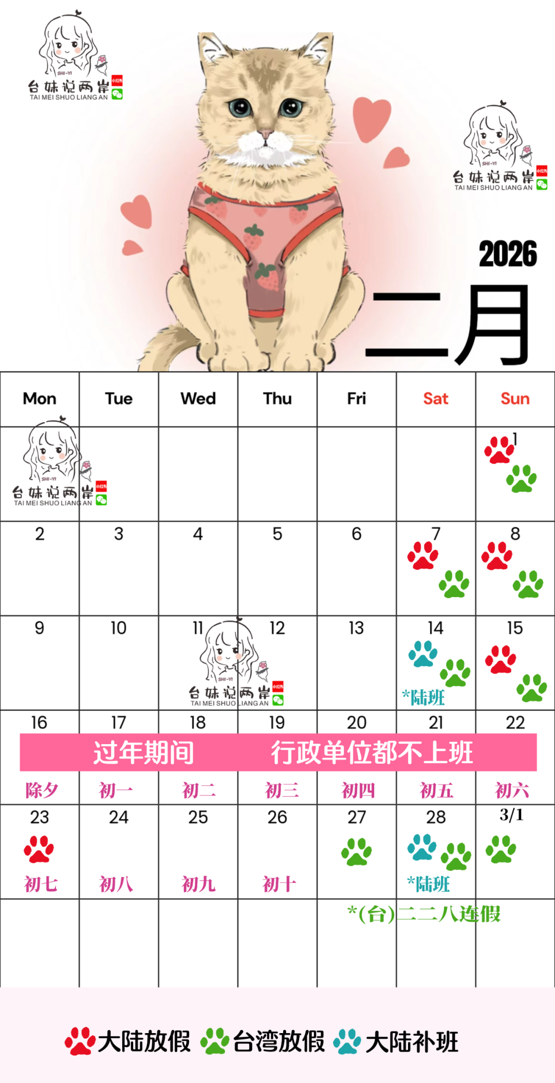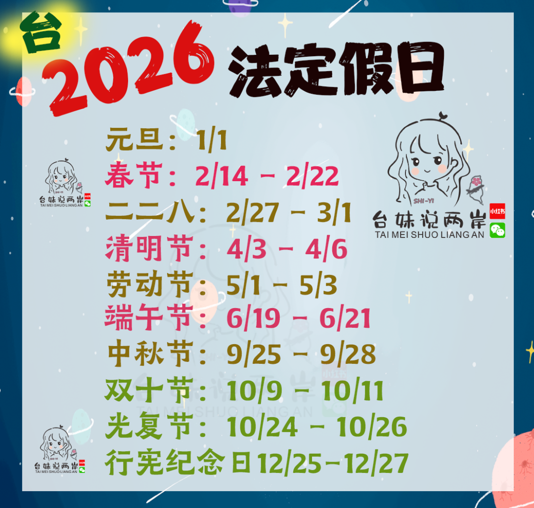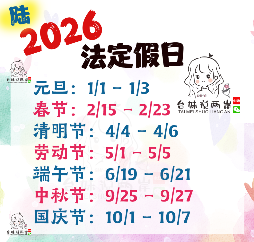 本周Top 5 2026國補補貼明細+核心要點 在陸生活 小壹 - 2026 年 1 月 1 日 2026年治安管理新規核心要點解讀 在陸生活 小壹 - 2026 年 1 月 1 日 台北捷運中山站惡性事件!男子持刀隨機砍人並投擲煙霧彈 在台生活 小壹 - 2025 年 12 月 19 日 最新反詐寶典16種詐騙套路+案例,轉發守護全家錢袋! 在陸生活 小壹 - 2025 年 12 月 16 日 1月1日起,未牽繩犬隻傷人,最高罰1000元+拘10天,合規養犬刻不容緩! 在陸生活 小壹 - 2025 年 12 月 16 日 其他相關文章 行動電源可帶上飛機嗎?2025最新登機規定 大陸旅遊攻略 冬季想玩又怕冷的寶子們,這6個小眾避寒天堂,人少便宜又好逛,還等什麼,直接衝! 大陸旅遊攻略 “七折車票”“低價酒店積分”?二手平台積分交易,當心陷阱! 在陸生活 2025-12-31 跨年演唱會指南:從廣州到台北,熱門場次一鍵收藏 在陸生活 《燕雲十六聲》和白石山景區聯動正式官宣!這麼近,那麼美,界碑到河北! 大陸旅遊攻略 不能帶入境|返陸 大陸旅遊攻略 2026年法定假日安排~公家單位這幾天沒上班 台灣旅遊攻略大陸旅遊攻略 Author: 小壹 2025 年 11 月 14 日 Less than 1 min.read FacebookTwitterPinterestWhatsApp 馬上又到年底了,又要開始倒數過年了 為了方便大家好請假,好安排假期 今年依然整理了行事曆 把兩岸放假日做在一起 提供大家可以提前規劃好行程跟買機票 ★兩岸婚姻、子女相關業務點這裡→諮詢時宜 ★旅遊、機票住宿相關業務點這裡→諮詢小壹 此文章圖文版權為微信公眾號:台妹說兩岸所有,本網站已取得授權,原創不易,分享文章請標註來源出處,謝謝~ Tags2026放假指南大陸旅遊旅遊安排旅遊找小壹旅遊攻略海外旅遊 上一篇文章常用LINE轉帳用戶注意!iPASS MONEY與LINE分家 年底全數移出下一篇文章微信綁定台灣VISA卡 Popular Articles 2026國補補貼明細+核心要點 2026年治安管理新規核心要點解讀 台北捷運中山站惡性事件!男子持刀隨機砍人並投擲煙霧彈 最新反詐寶典16種詐騙套路+案例,轉發守護全家錢袋! 1月1日起,未牽繩犬隻傷人,最高罰1000元+拘10天,合規養犬刻不容緩!