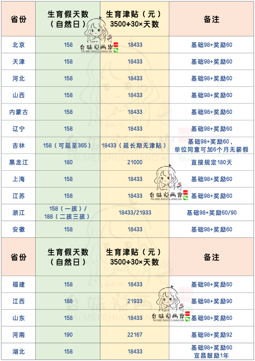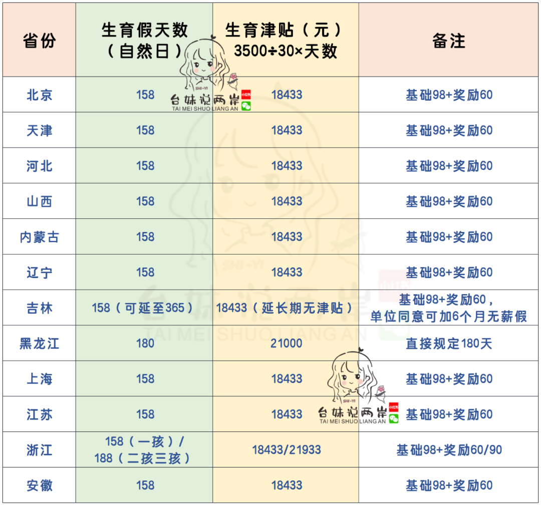 計算公式明確:生育津貼=單位上年度月平均工資÷30×產假天數,基礎產假98天,各省額外加30-60天獎勵假,難產+15天、多胞胎每多生1個+15天。