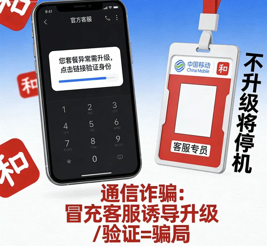 冒充移動、聯通客服,謊稱「誤開通高價套餐、增值業務自動扣費、寬頻即將到期、積分可兌換禮品」,以「取消業務、退還扣費、兌換福利」為由,誘點擊釣魚鏈接、提供驗證碼或轉帳「手續費」。